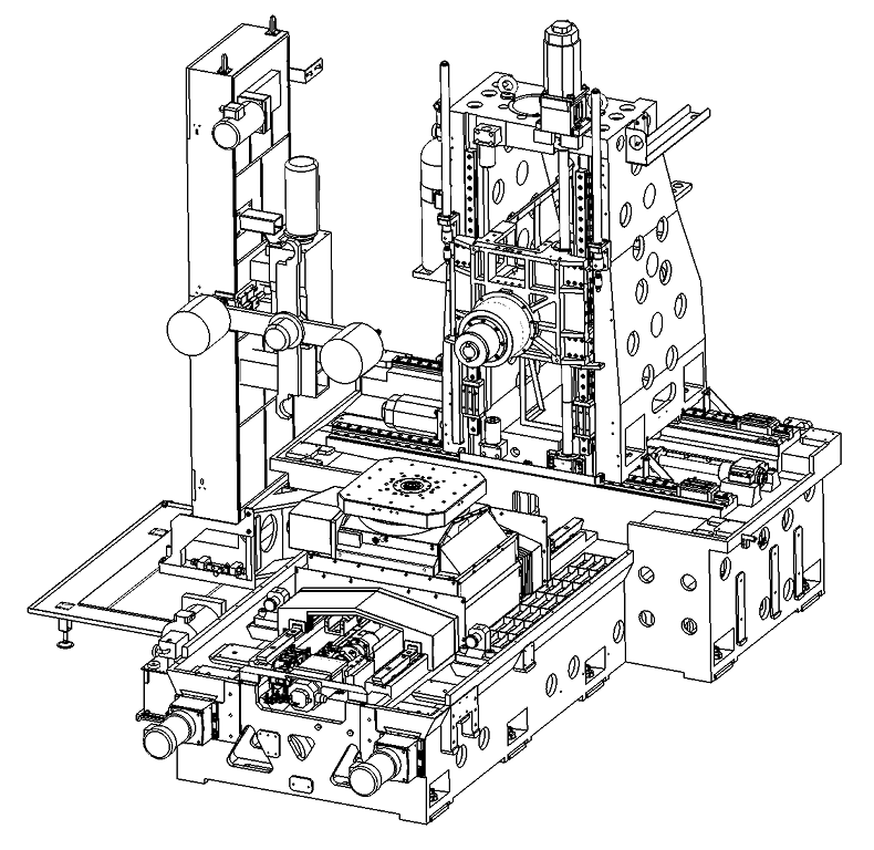 The HMC800G horizontal machining center adopts a positive T-shaped structure, an integral base, a large-span double-layer wall column. The three axes are equipped with heavy-duty roller guides, endowing the whole machine with high structural rigidity. The machine tool utilizes a forced cooling system for the lead screw bearings and a forced cooling system for the belt-driven spindle, which effectively ensures the accuracy stability of the machine tool. This machine tool is capable of carrying out batch multi-sided machining for parts such as boxes, discs, plates, shells, and machine bases, and is also suitable for the finishing of various molds.